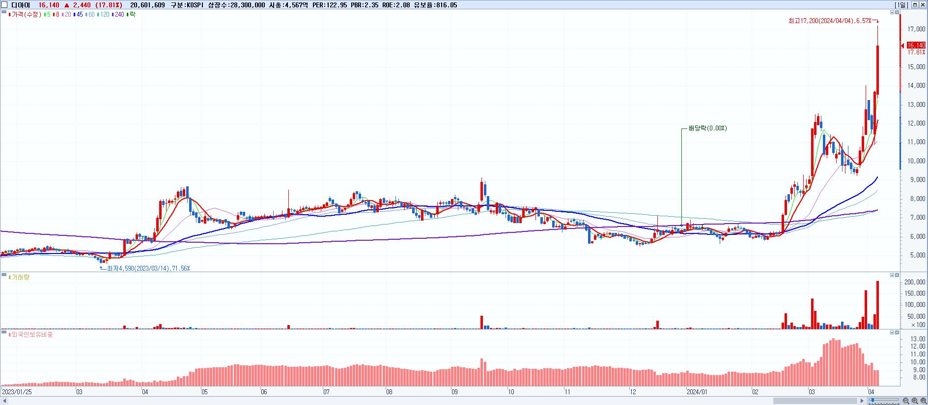 - 디아이 (16,140원 ▲ 17.81% , 시총: 4,568억, 거래량: 20,601,609, 거래대금:3,212억)