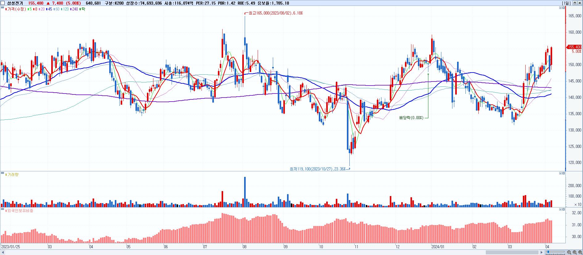 - 삼성전기 (155,400원 ▲ 5% , 시총: 116,074억, 외국인 순매수 거래금:236억)