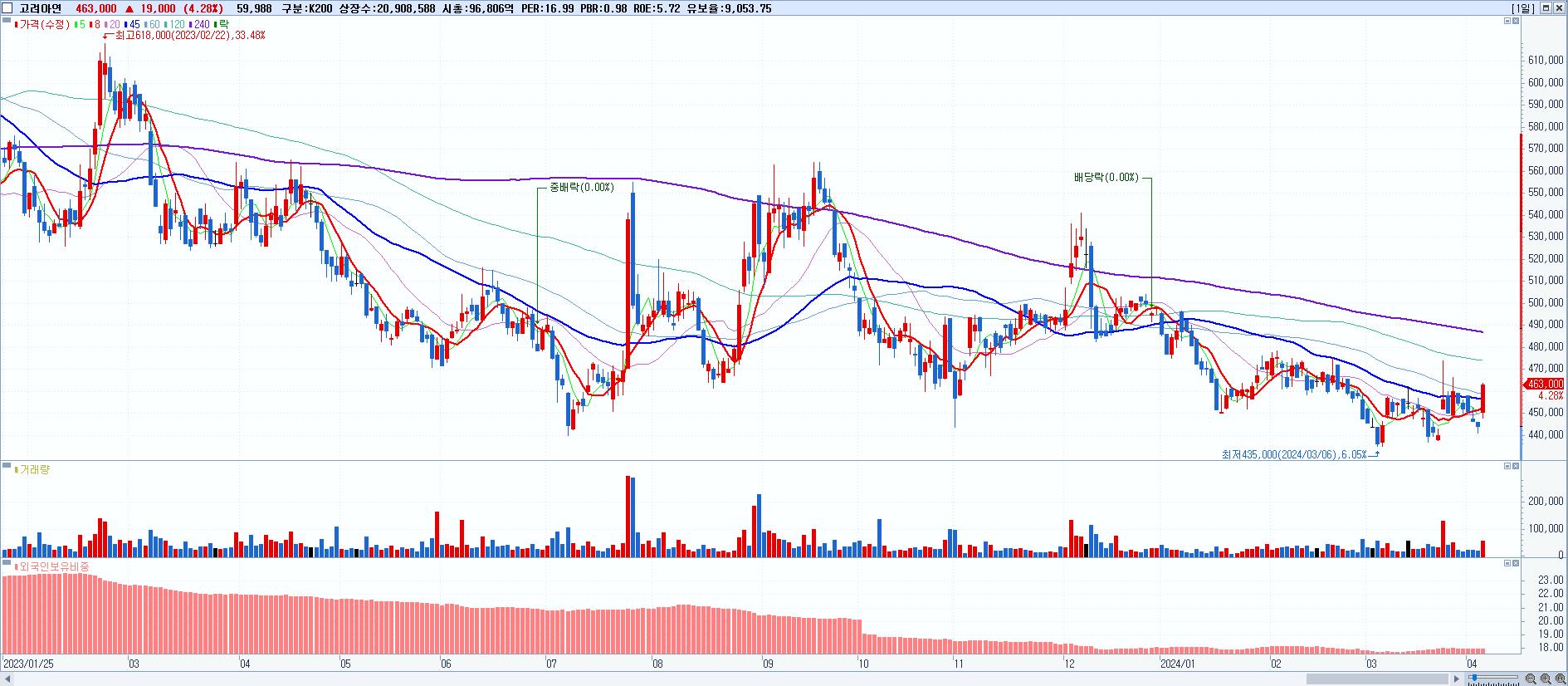 - 고려아연 (463,000원 ▲ 4.28% , 시총: 96,807억, 외국인 순매수 거래금:87억)