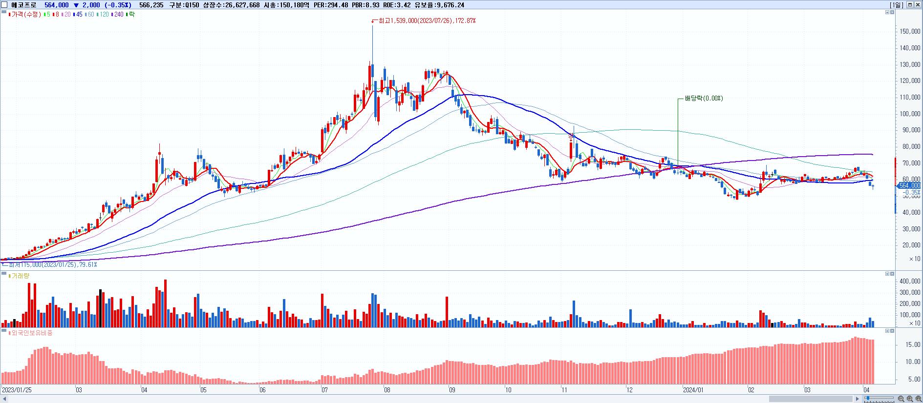 - 에코프로 (564,000원 ▼ -0.35% , 시총: 150,180억, 외국인 순매수 거래금:59억)