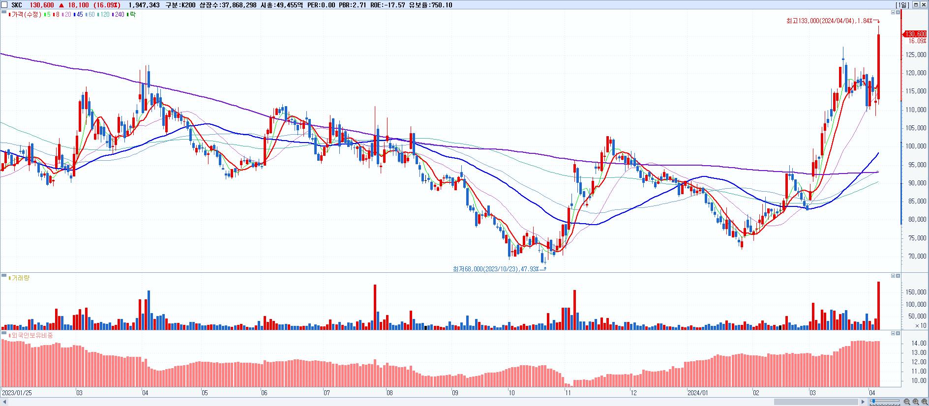 - SKC (130,600원 ▲ 16.09% , 시총: 49,456억, 외국인 순매수 거래금:120억)