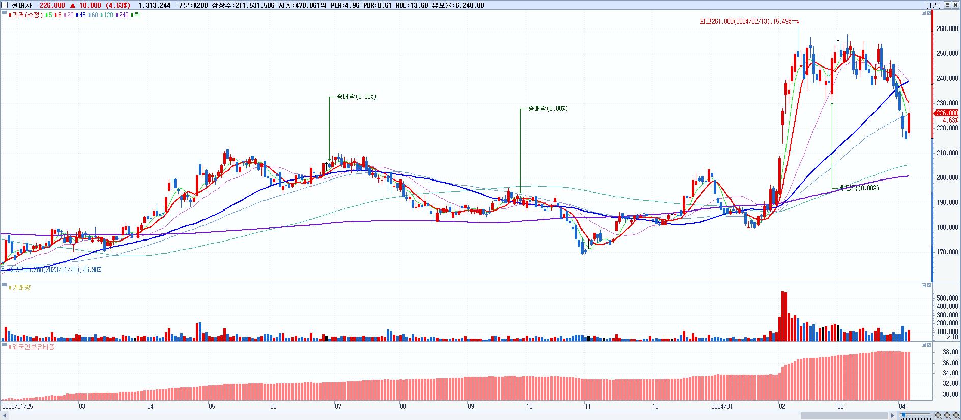 - 현대차 (226,000원 ▲ 4.63% , 시총: 478,061억, 외국인 순매수 거래금:68억)
