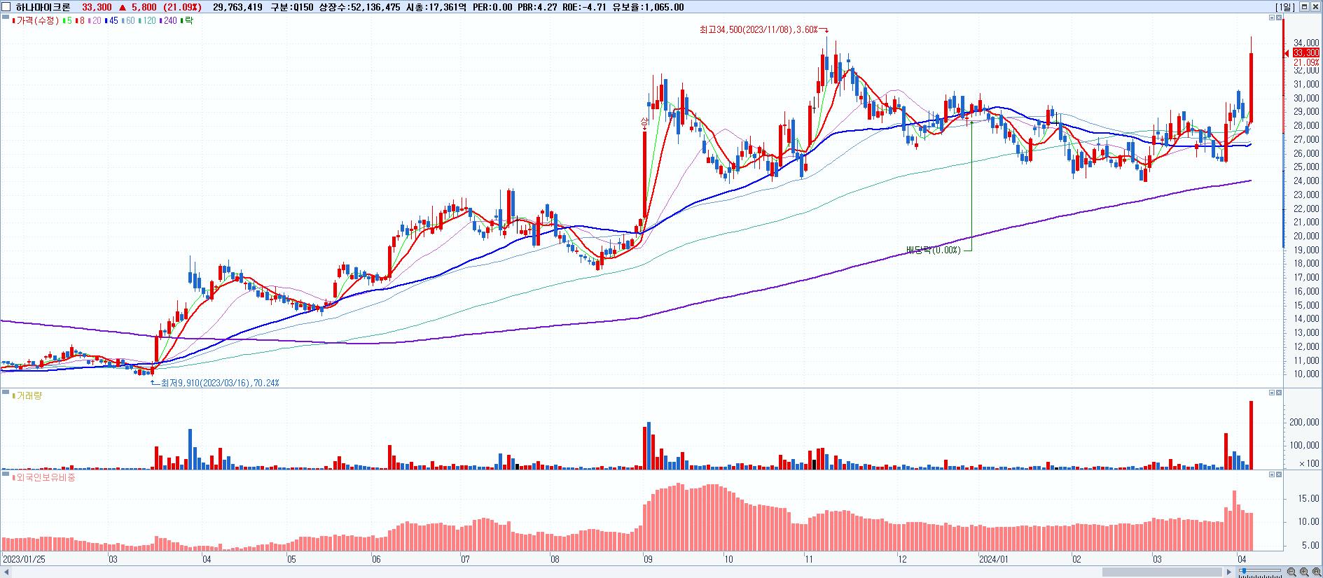 - 하나마이크론 (33,300원 ▲ 21.09% , 시총: 17,361억, 외국인 순매수 거래금:646억)