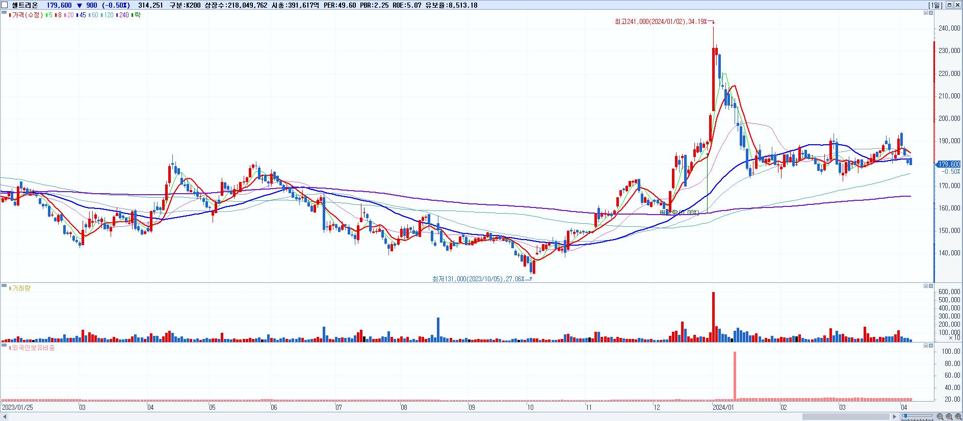 - 셀트리온 (179,600원 ▼ -0.5% , 시총: 391,617억, 외국인 순매수 거래금:76억)