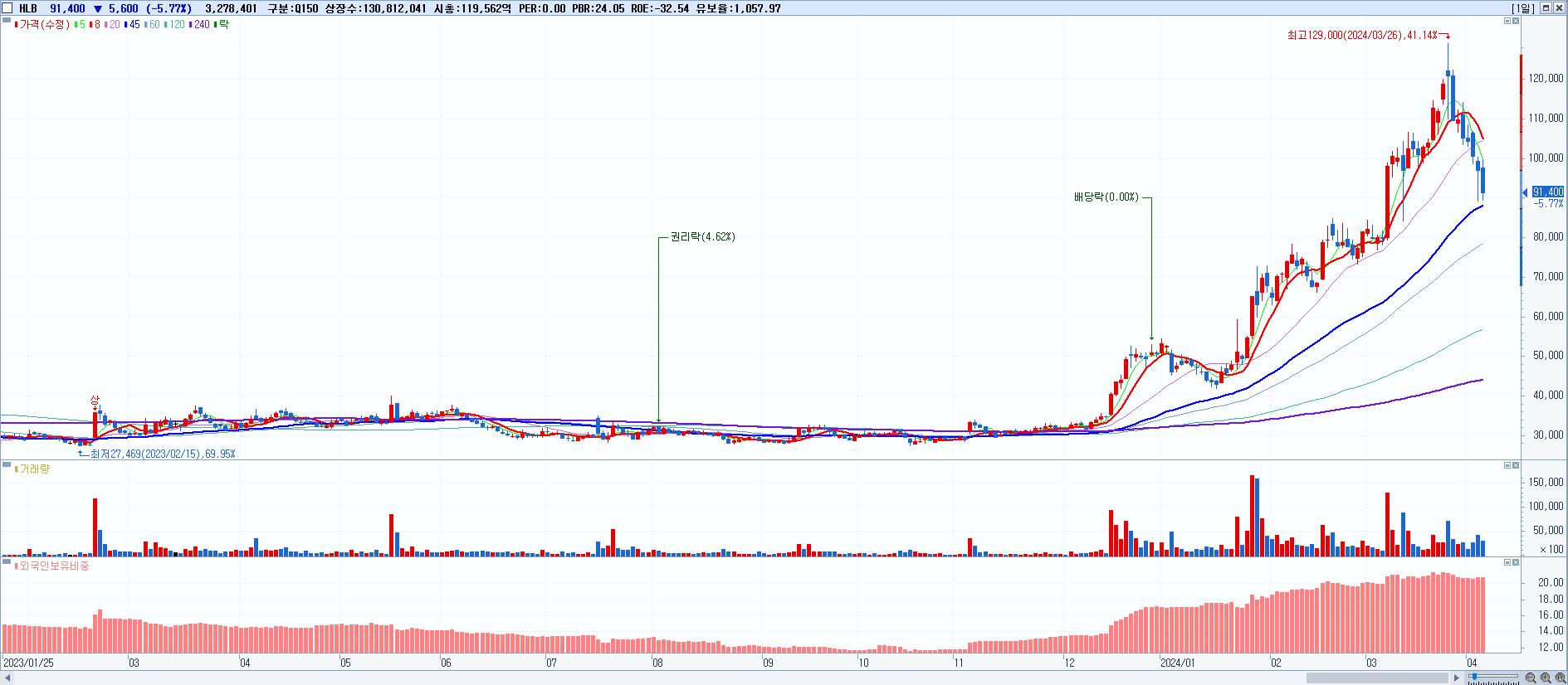 - HLB (91,400원 ▼ -5.77% , 시총: 119,562억, 외국인 순매수 거래금:87억)