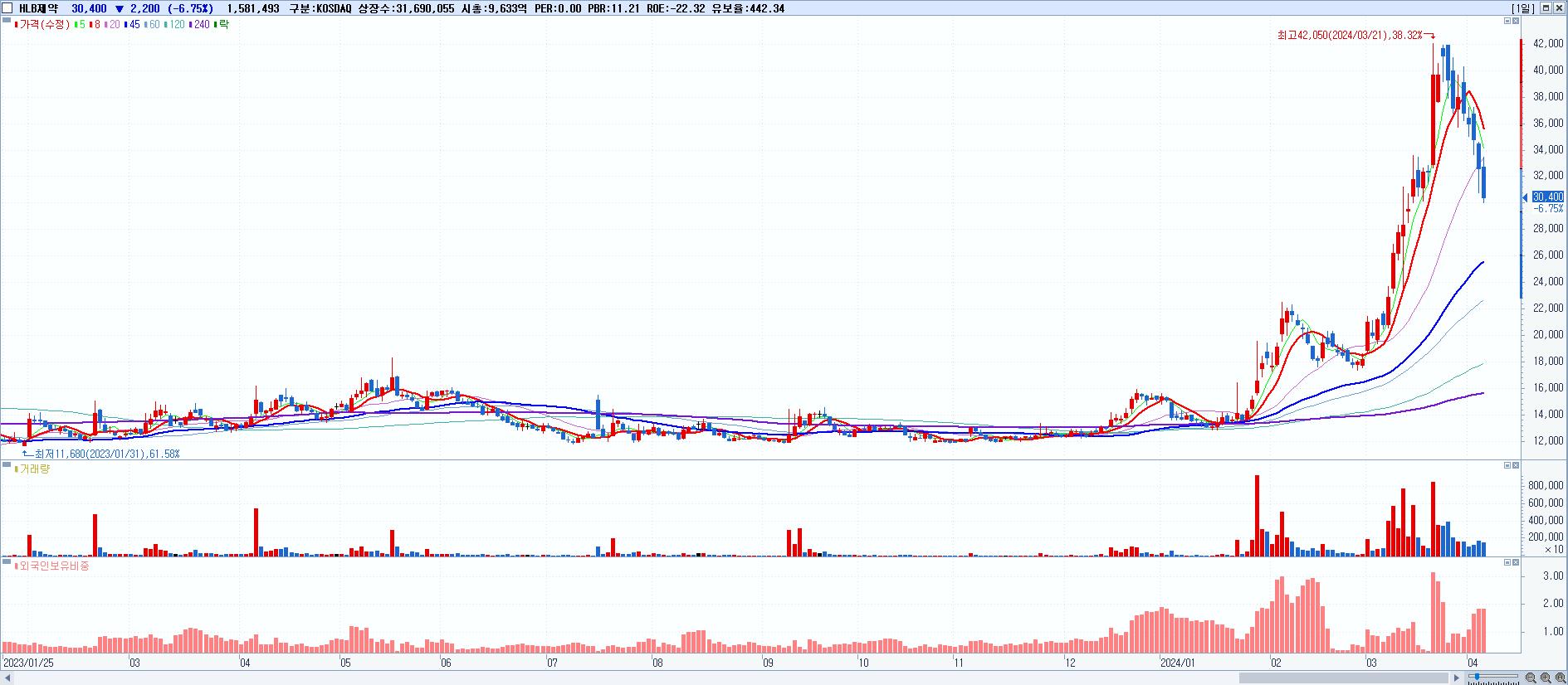 - HLB제약 (30,400원 ▼ -6.75% , 시총: 9,634억, 외국인 순매수 거래금:62억)