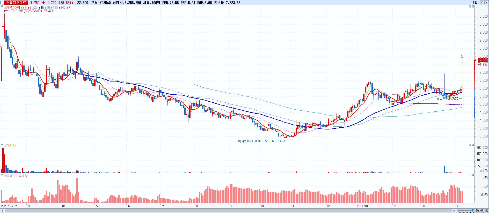 - 스튜디오미르 (7,780원 ▲ 29.88% , 시총: 409억, 거래량: 22,800, 거래대금:2억)