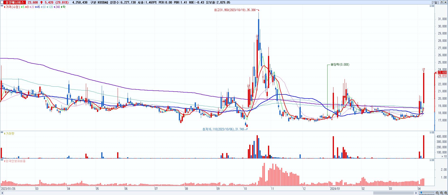 - 중앙에너비스 (23,600원 ▲ 29.81% , 시총: 1,470억, 거래량: 4,250,438, 거래대금:965억)