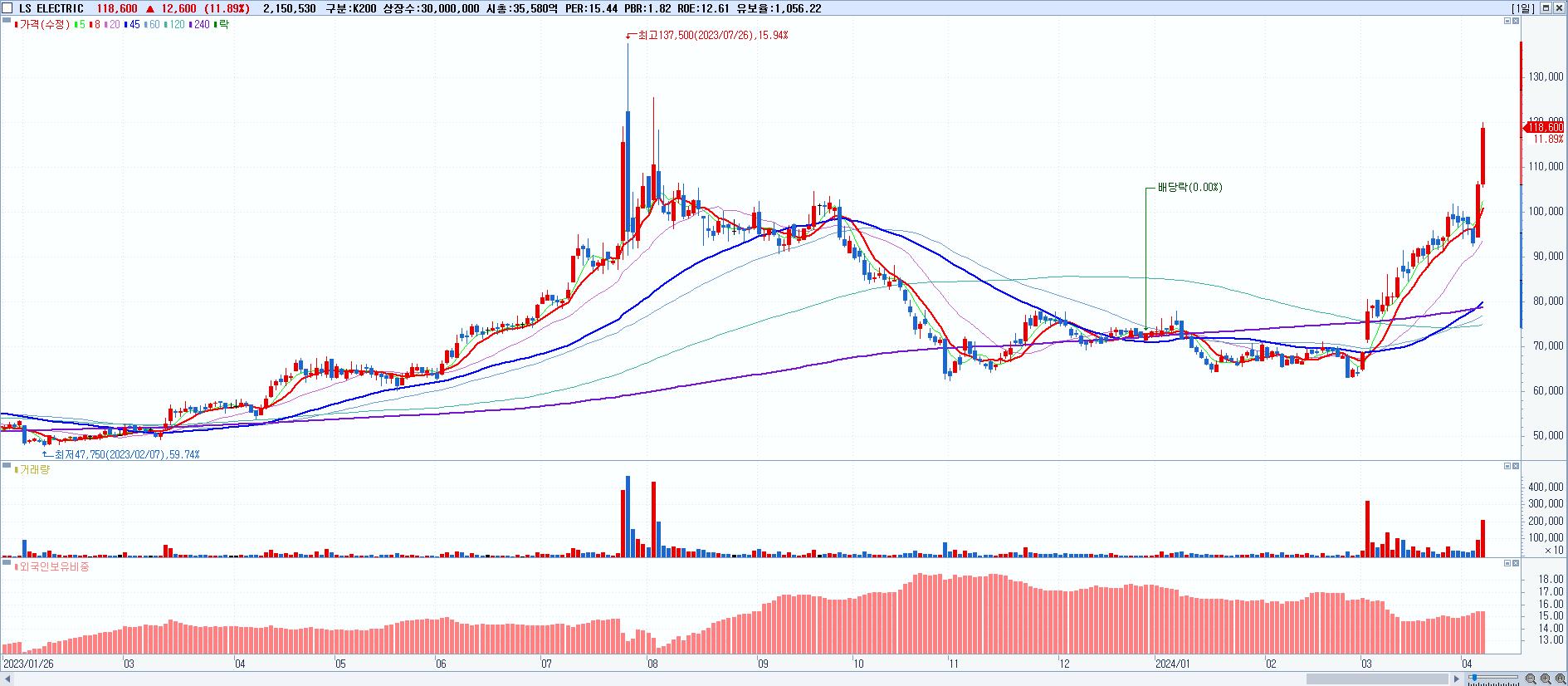 - LS ELECTRIC (118,600원 ▲ 11.89% , 시총: 35,580억, 거래량: 2,150,530, 거래대금:2,482억)
