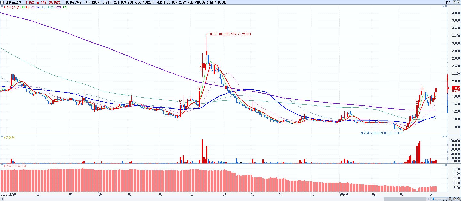 - 에이프로젠 (1,822원 ▲ 8.45% , 시총: 4,825억, 거래량: 16,152,749, 거래대금:281억)