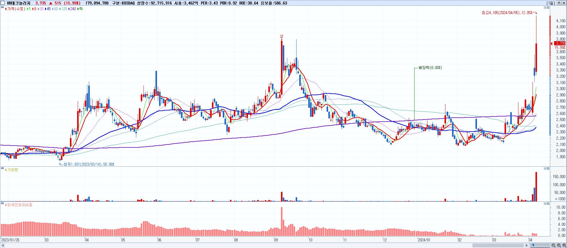 - HB테크놀러지 (3,735원 ▲ 15.99% , 시총: 3,463억, 거래량: 179,894,788, 거래대금:6,804억)