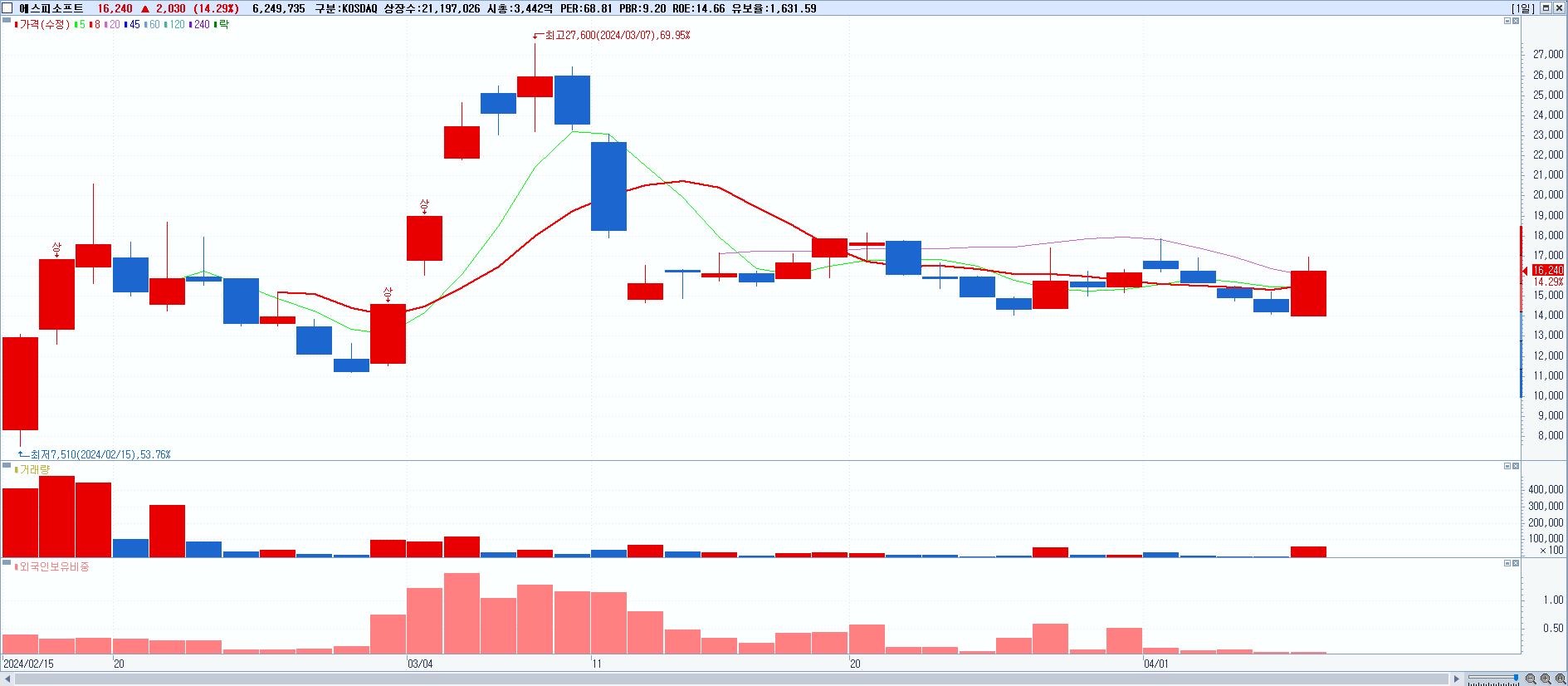 - 에스피소프트 (16,240원 ▲ 14.29% , 시총: 3,442억, 거래량: 6,249,735, 거래대금:1,003억)