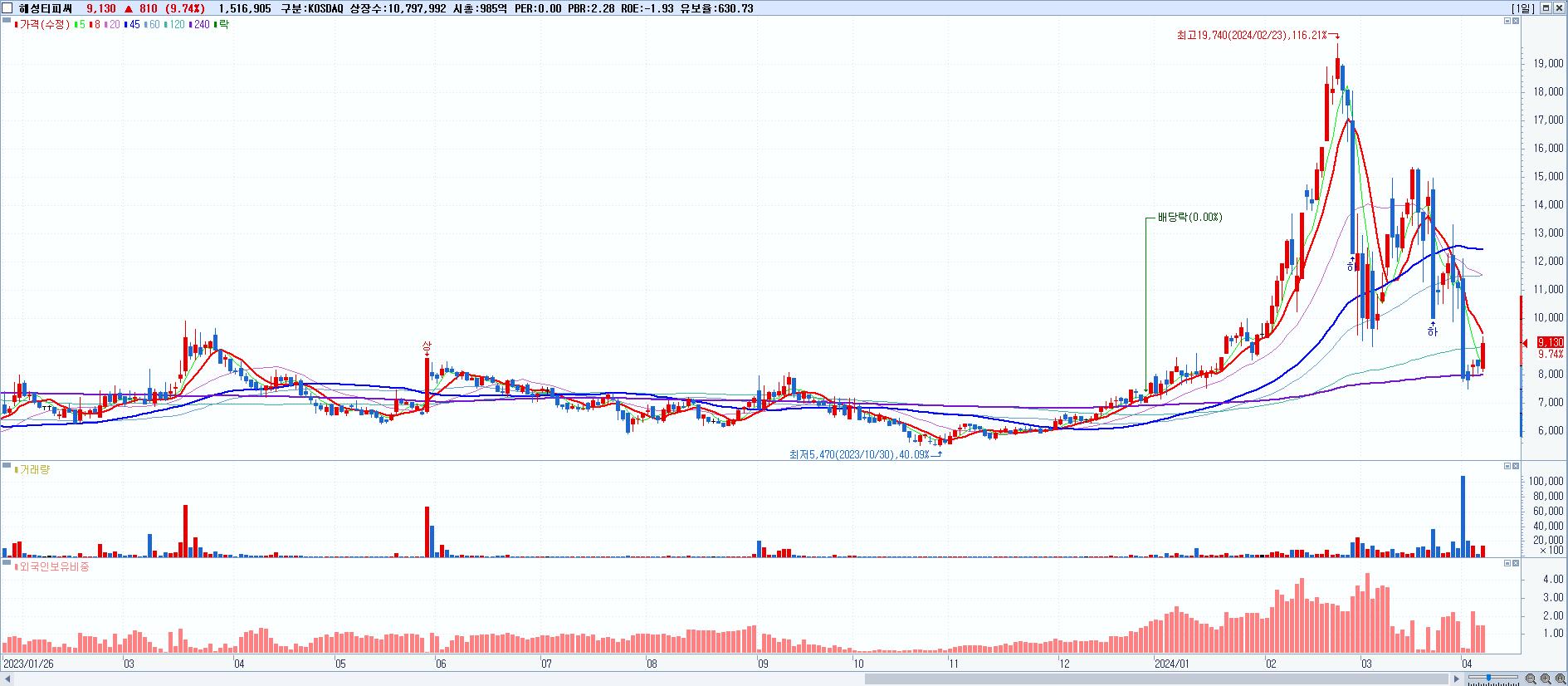 - 해성티피씨 (9,130원 ▲ 9.74% , 시총: 986억, 거래량: 1,516,905, 거래대금:136억)