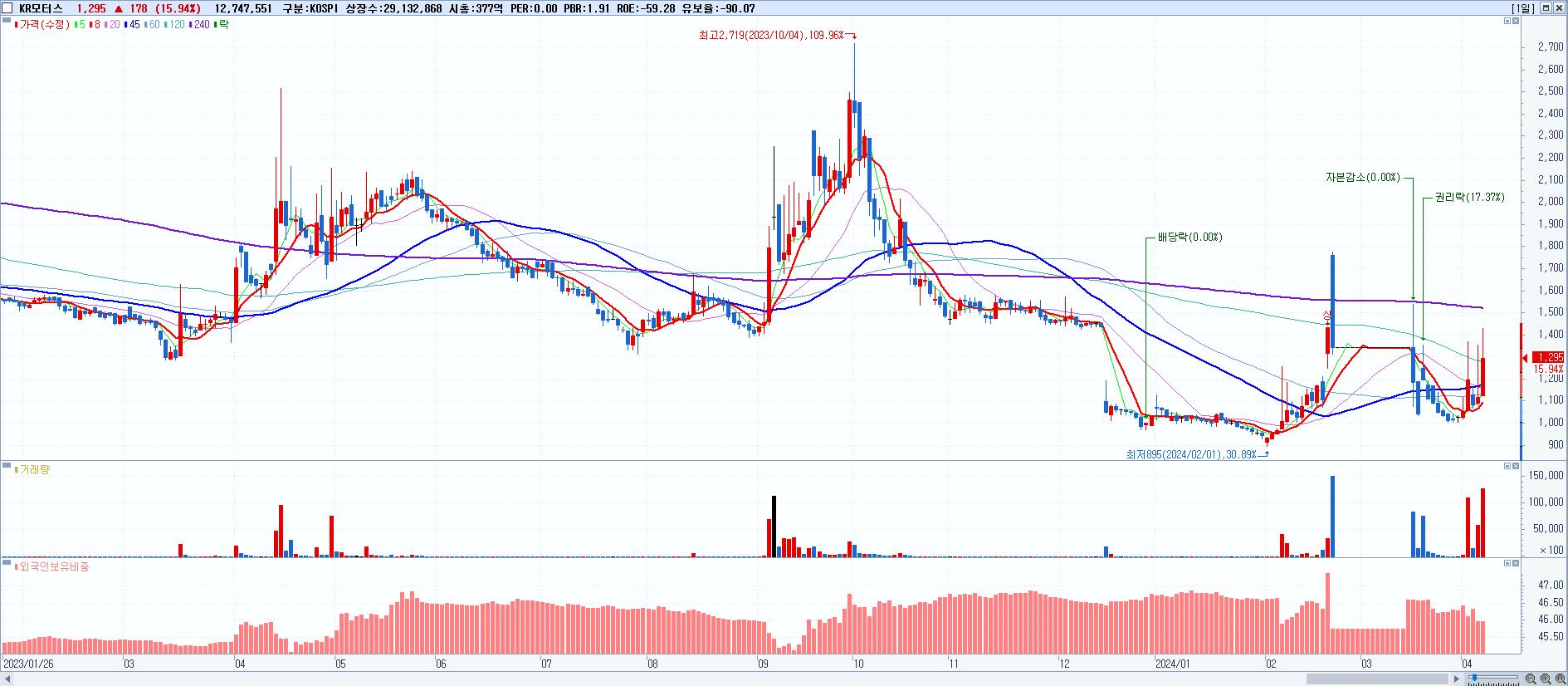 - KR모터스 (1,295원 ▲ 15.94% , 시총: 377억, 거래량: 12,747,551, 거래대금:170억)