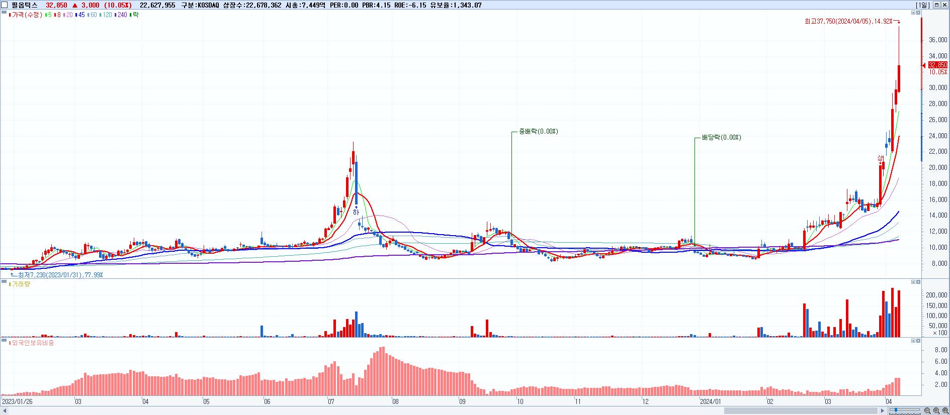 - 필옵틱스 (32,850원 ▲ 10.05% , 시총: 7,450억, 거래량: 22,627,955, 거래대금:7,689억)