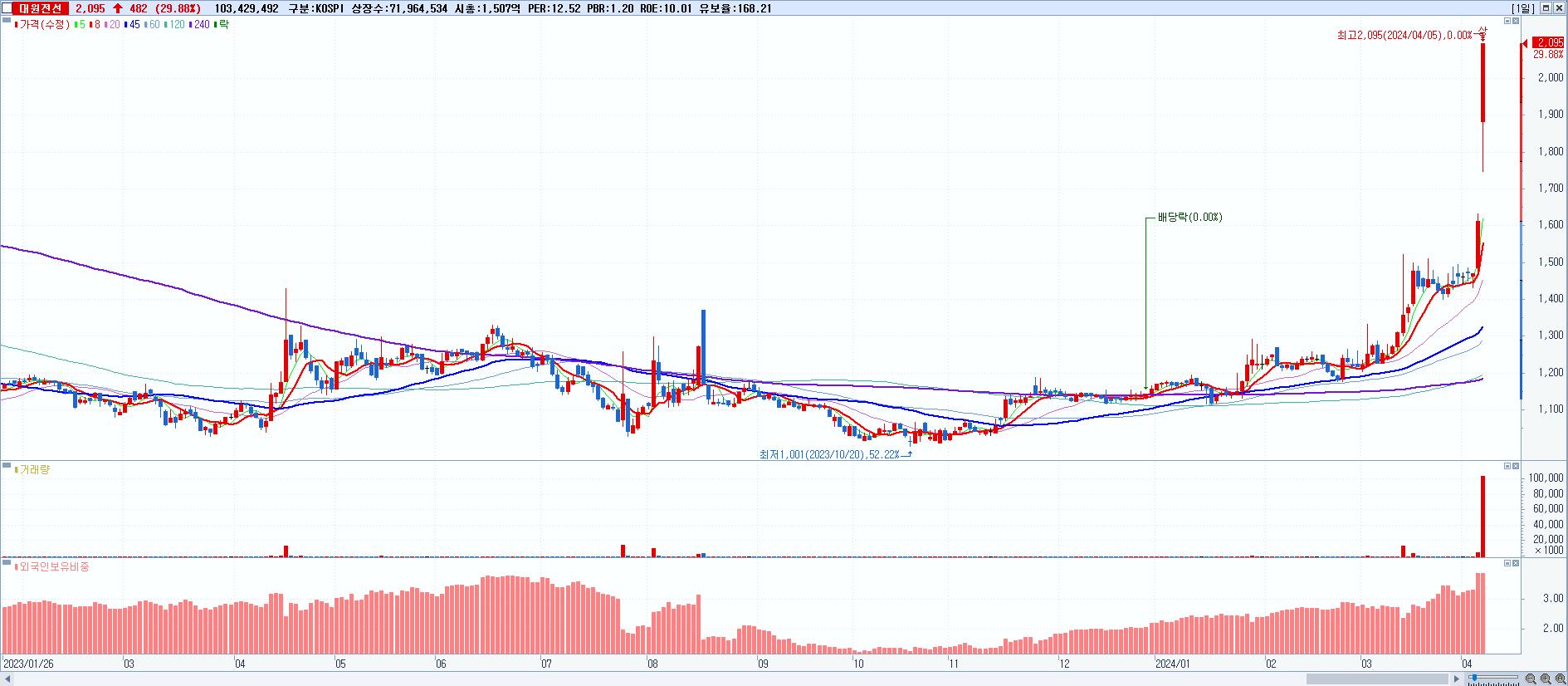 1.대원전선 2,095원 ▲ 29.88% (KOSPI, 006340)