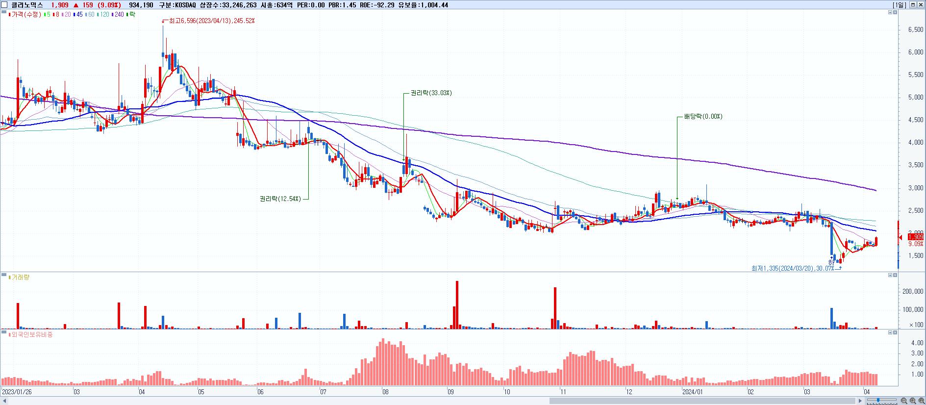 - 클리노믹스 (1,909원 ▲ 9.09% , 시총: 635억, 거래량: 934,190, 거래대금:17억)