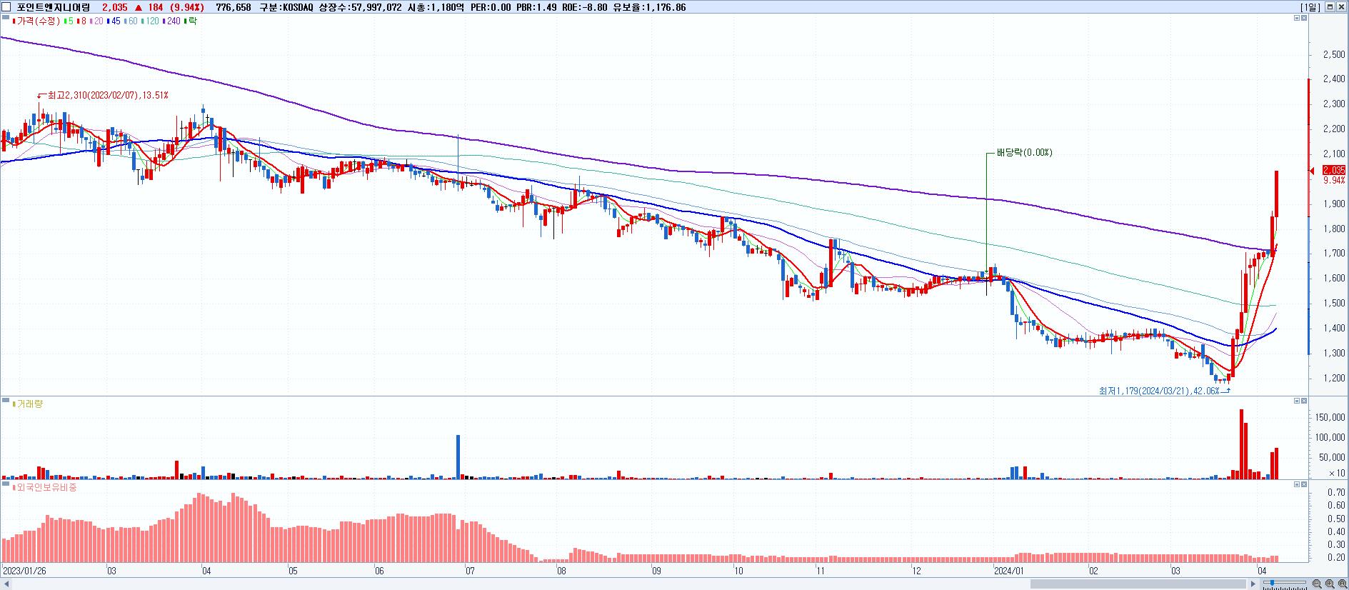 - 포인트엔지니어링 (2,035원 ▲ 9.94% , 시총: 1,180억, 거래량: 776,658, 거래대금:15억)