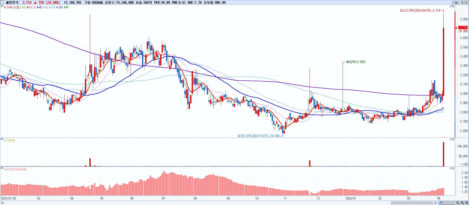 - 세명전기 (3,710원 ▲ 24.08% , 시총: 566억, 거래량: 12,168,765, 거래대금:429억)