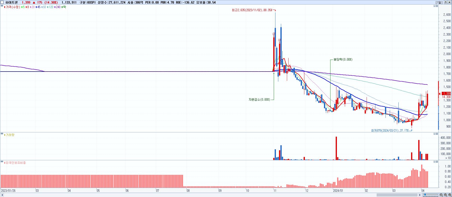- 하이트론 (1,399원 ▲ 14.3% , 시총: 386억, 거래량: 1,133,911, 거래대금:15억)