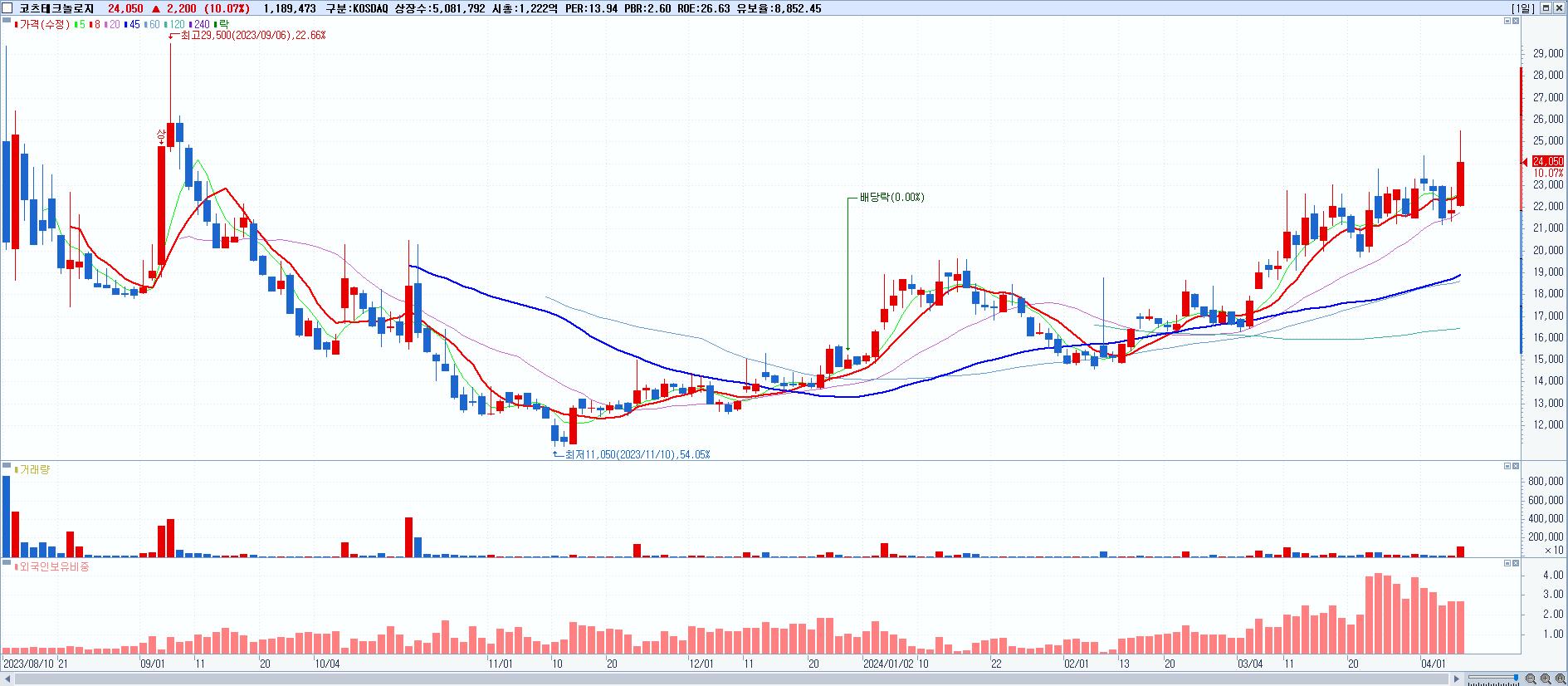 - 코츠테크놀로지 (24,050원 ▲ 10.07% , 시총: 1,222억, 거래량: 1,189,473, 거래대금:290억)