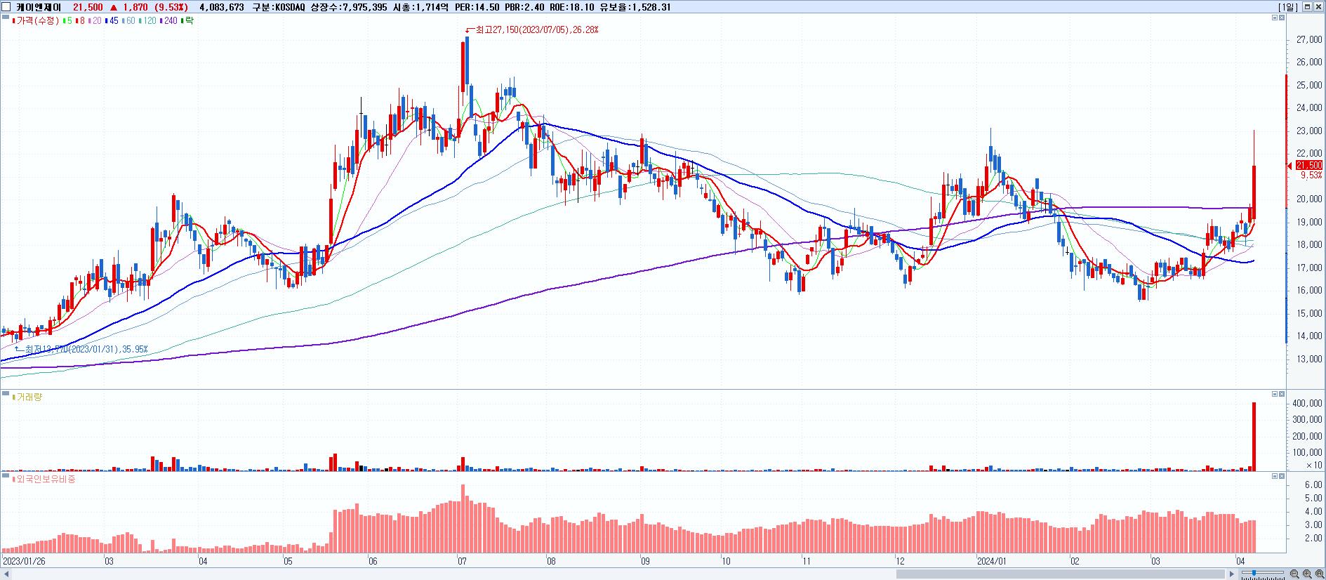 - 케이엔제이 (21,500원 ▲ 9.53% , 시총: 1,715억, 거래량: 4,083,673, 거래대금:865억)