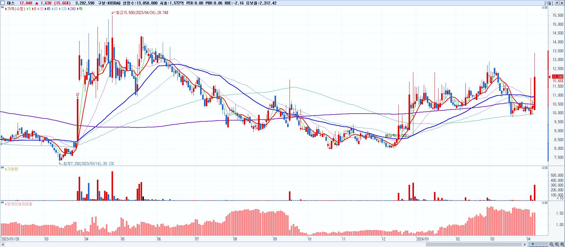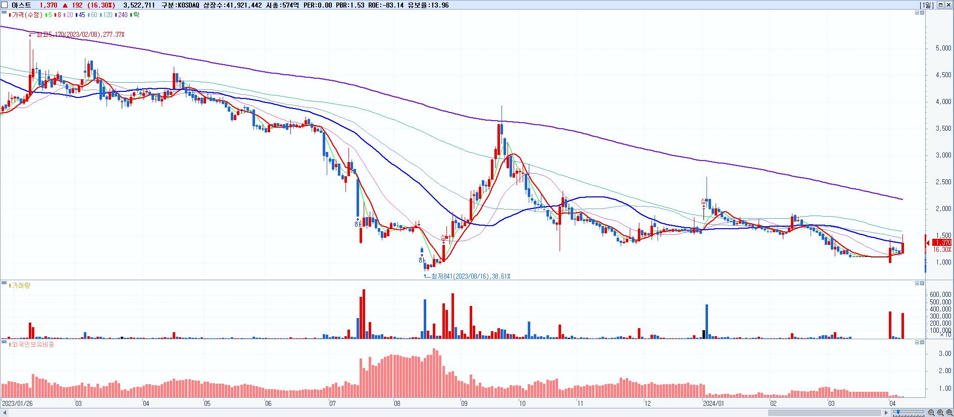 - 아스트 (1,370원 ▲ 16.3% , 시총: 574억, 거래량: 3,522,711, 거래대금:50억)