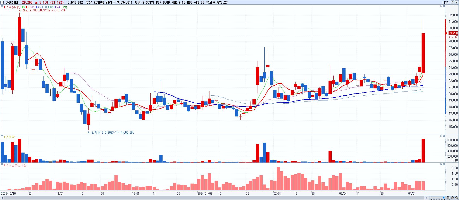 - 아이엠티 (29,250원 ▲ 21.12% , 시총: 2,303억, 거래량: 8,548,542, 거래대금:2,449억)