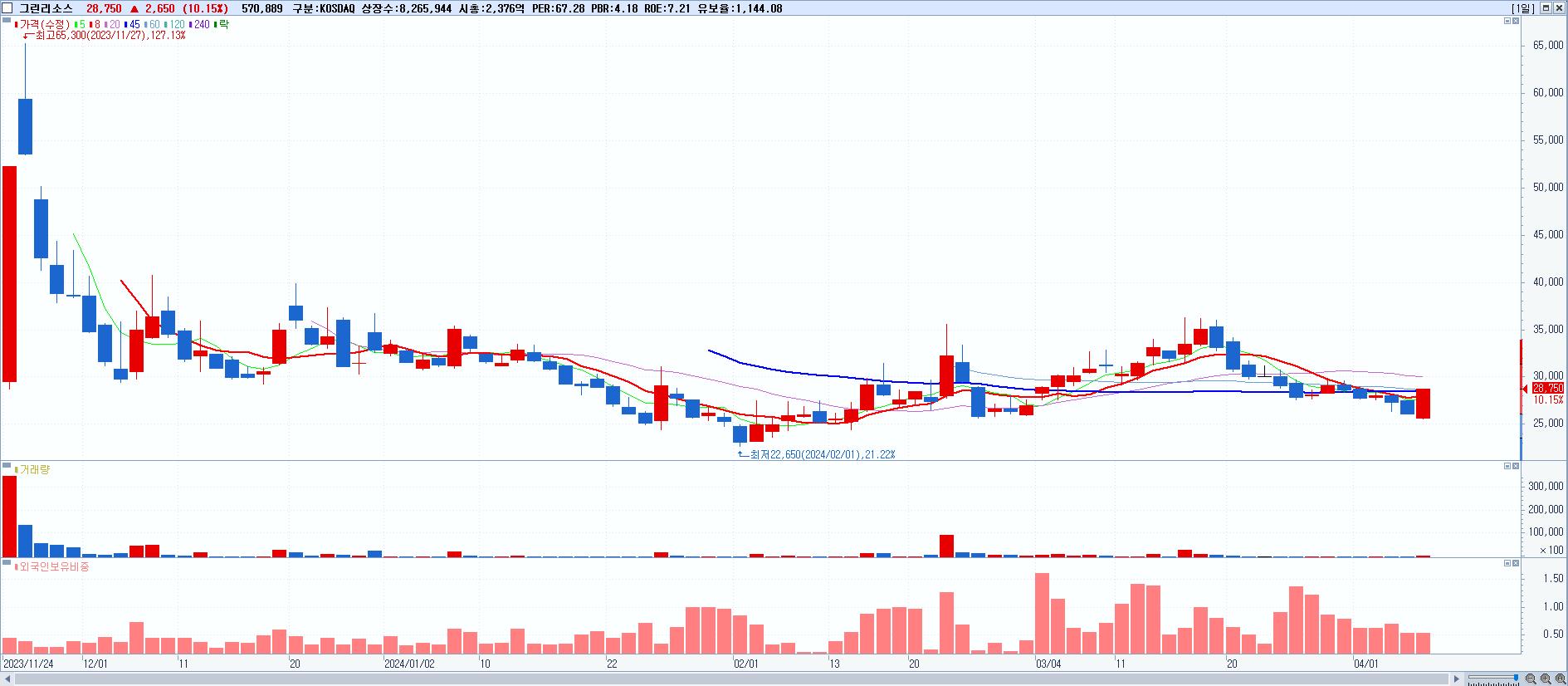 - 그린리소스 (28,750원 ▲ 10.15% , 시총: 2,376억, 거래량: 570,889, 거래대금:155억)