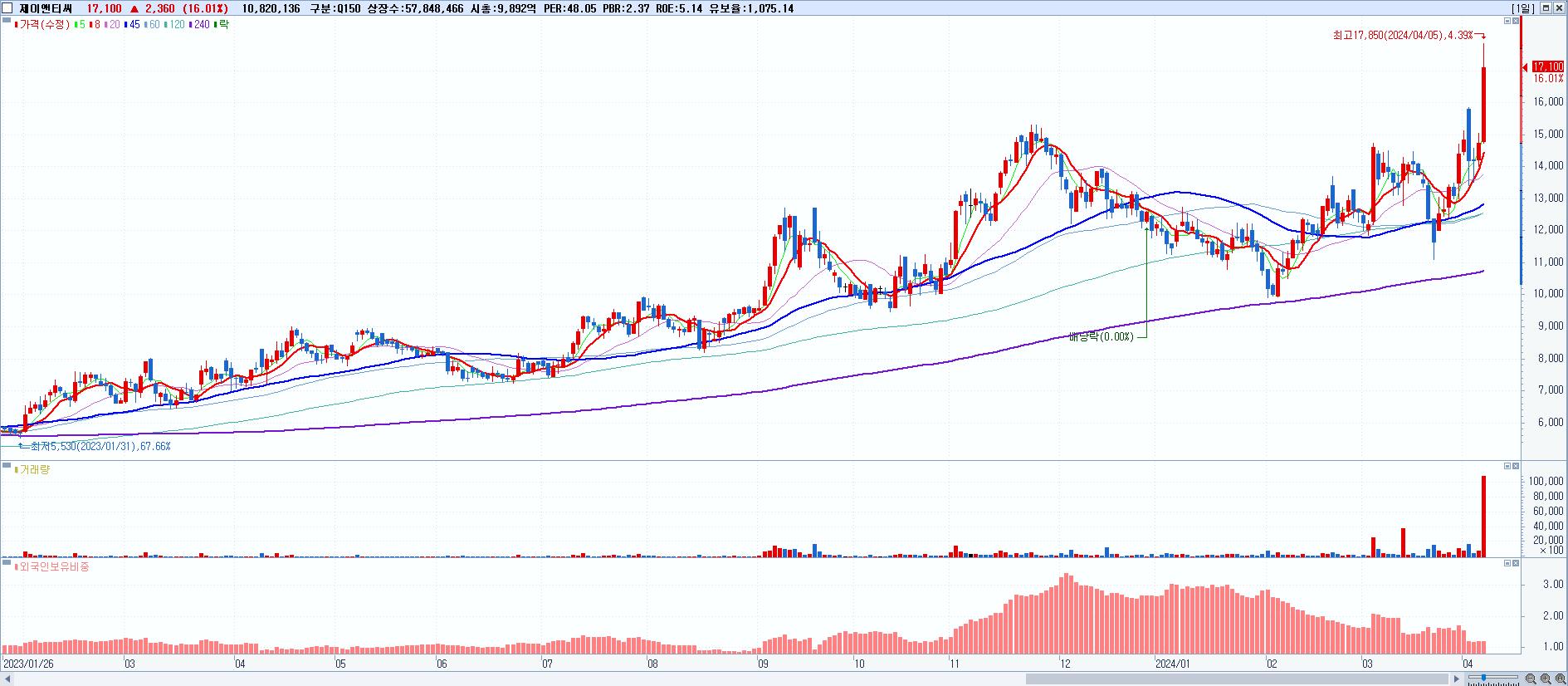 - 제이앤티씨 (17,100원 ▲ 16.01% , 시총: 9,892억, 거래량: 10,820,136, 거래대금:1,803억)