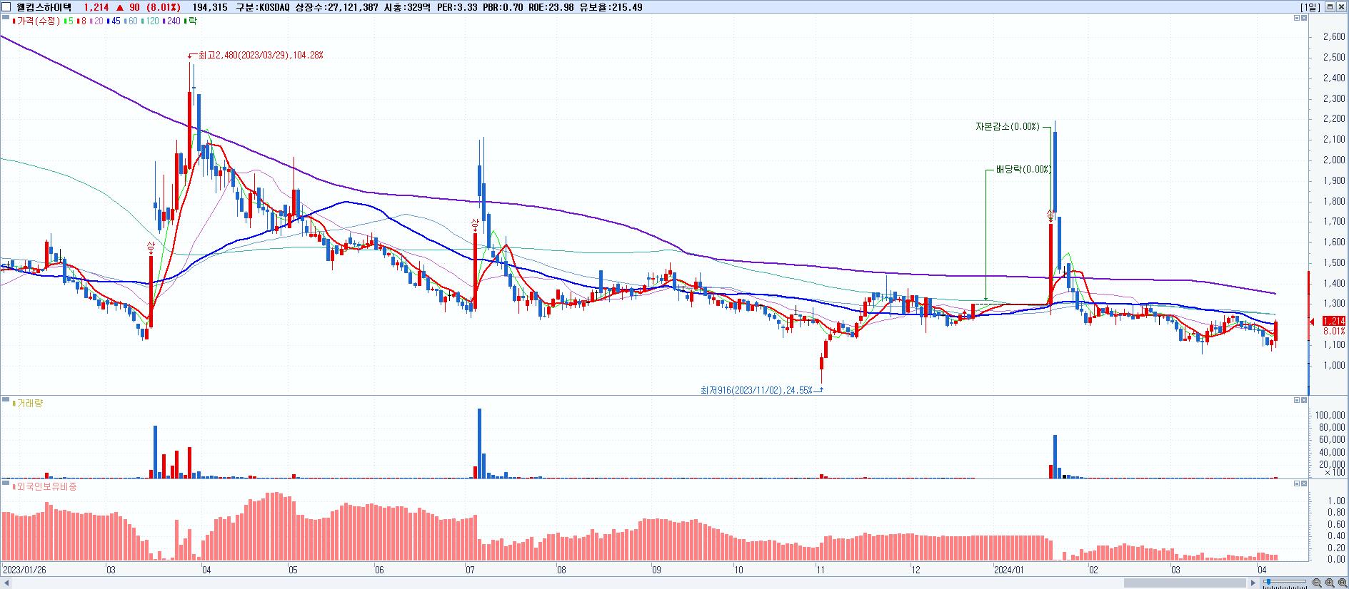 - 웰킵스하이텍 (1,214원 ▲ 8.01% , 시총: 329억, 거래량: 194,315, 거래대금:2억)