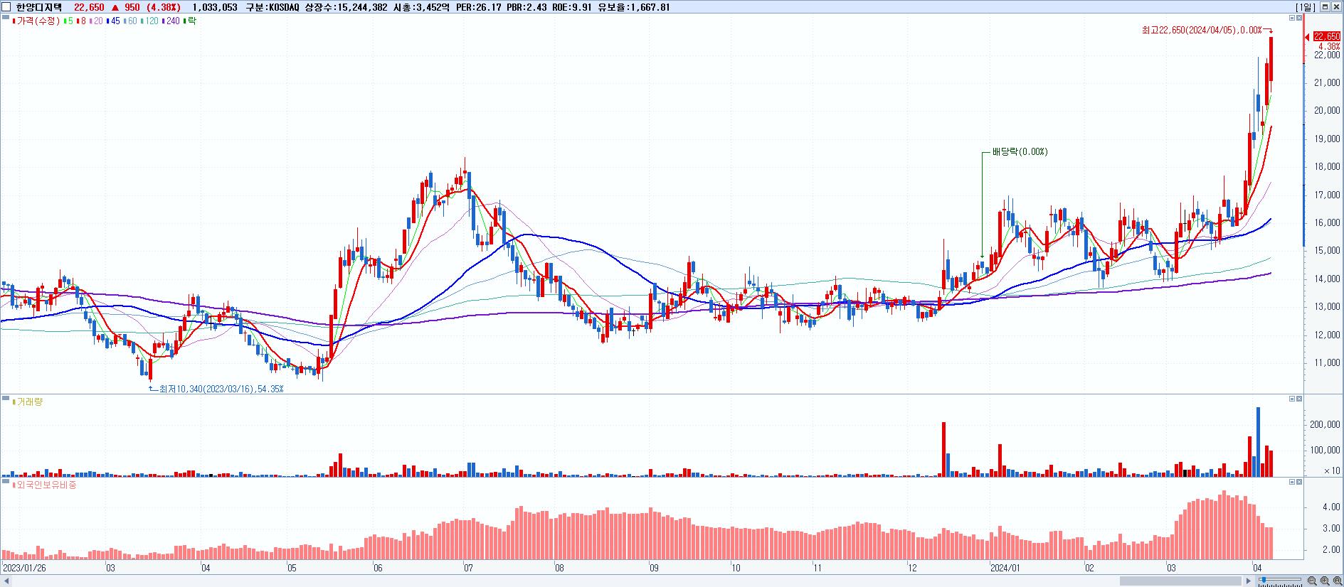 - 한양디지텍 (22,650원 ▲ 4.38% , 시총: 3,453억, 거래량: 1,033,053, 거래대금:224억, KOSDAQ)