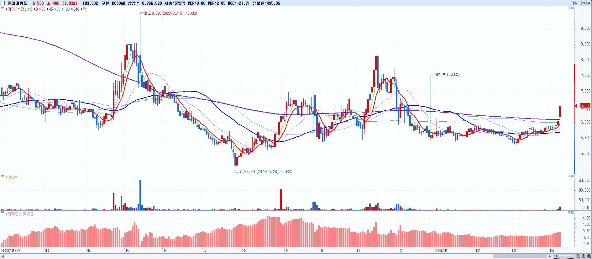 - 플레이위드 (6,530원 ▲ 7.93% , 시총: 572억, 거래량: 183,332, 거래대금:12억)