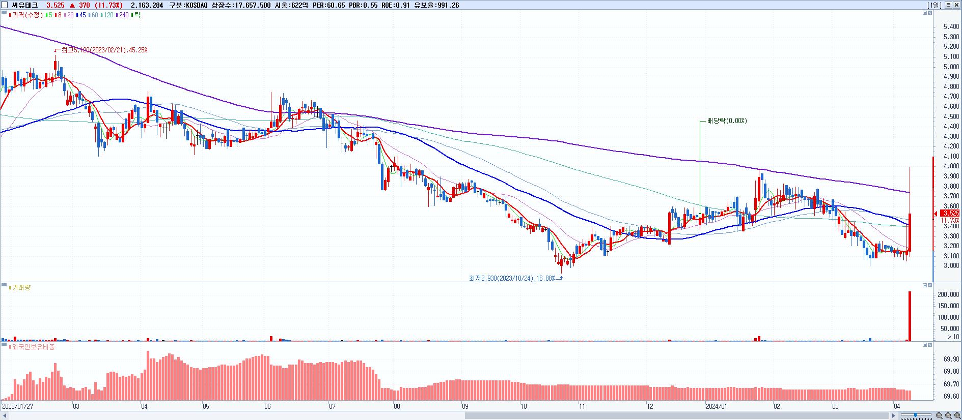 - 씨유테크 (3,525원 ▲ 11.73% , 시총: 622억, 거래량: 2,163,284, 거래대금:80억)