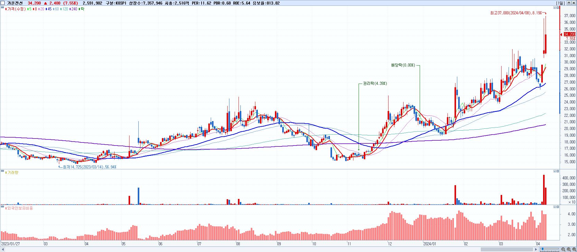 - 가온전선 (34,200원 ▲ 7.55% , 시총: 2,516억, 거래량: 2,591,902, 거래대금:902억)
