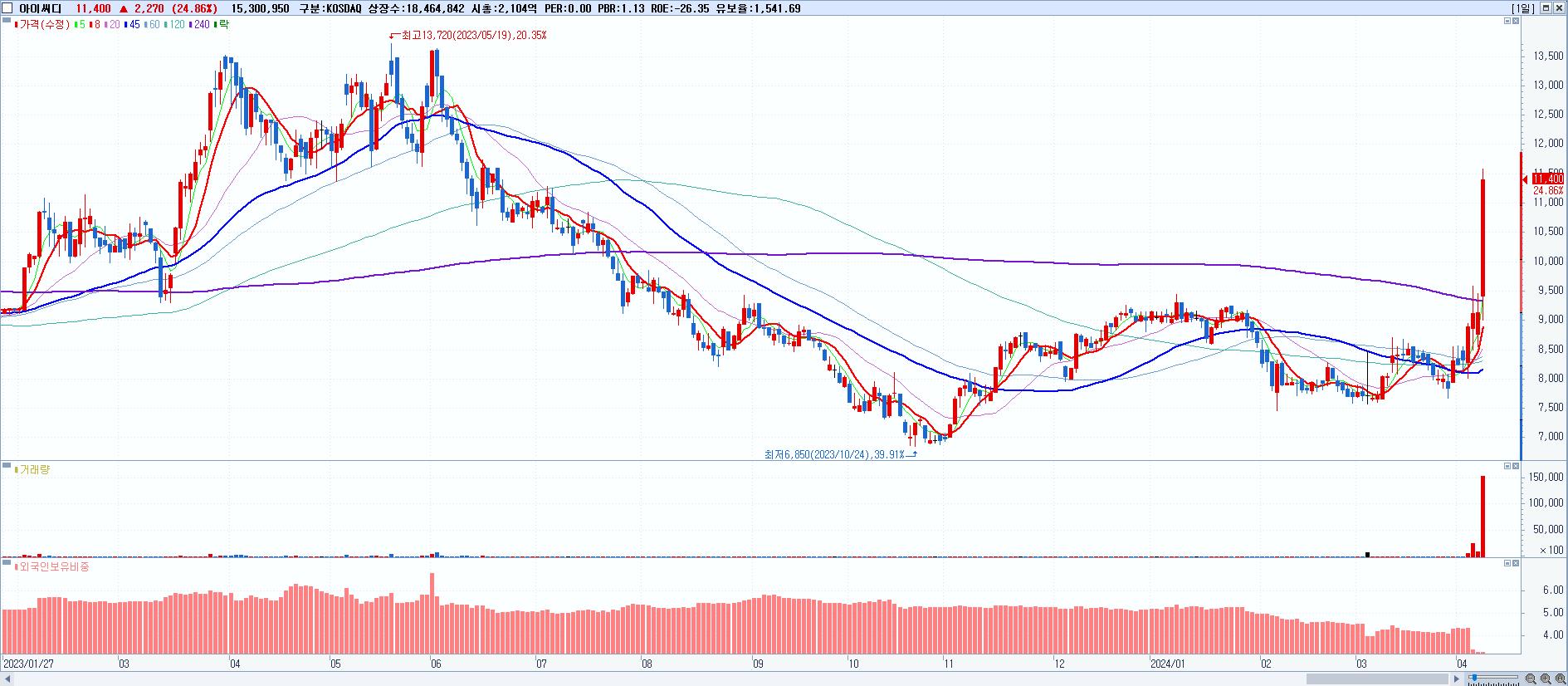 - 아이씨디 (11,400원 ▲ 24.86% , 시총: 2,105억, 거래량: 15,300,950, 거래대금:1,621억)