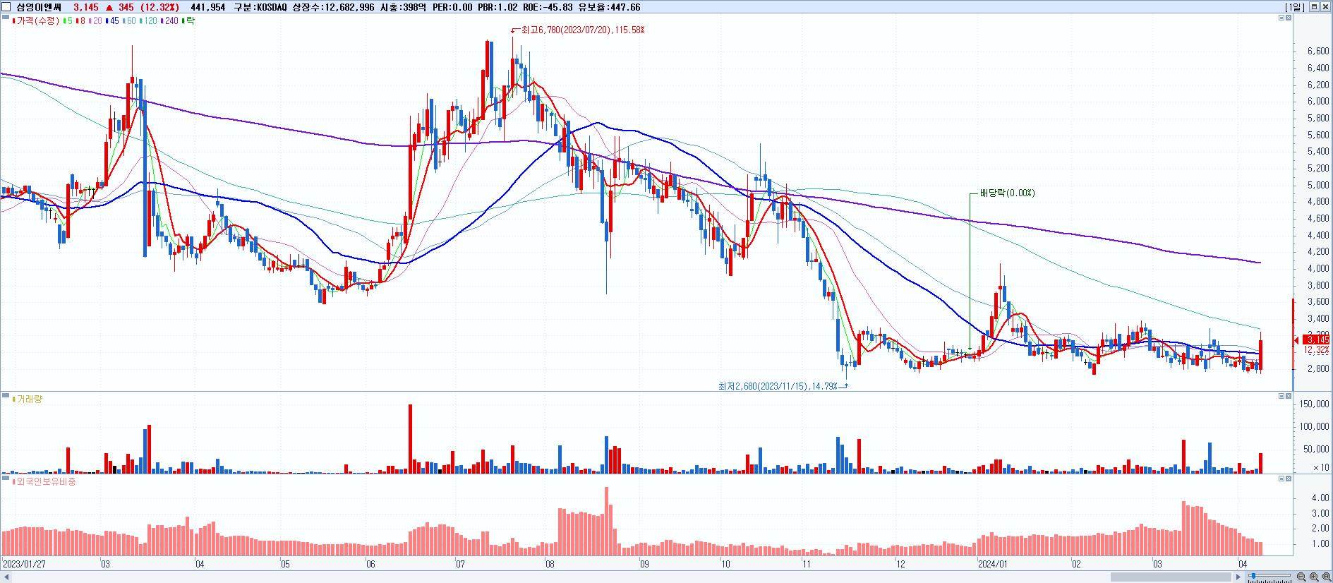 - 삼영이엔씨 (3,145원 ▲ 12.32% , 시총: 399억, 거래량: 441,954, 거래대금:13억)