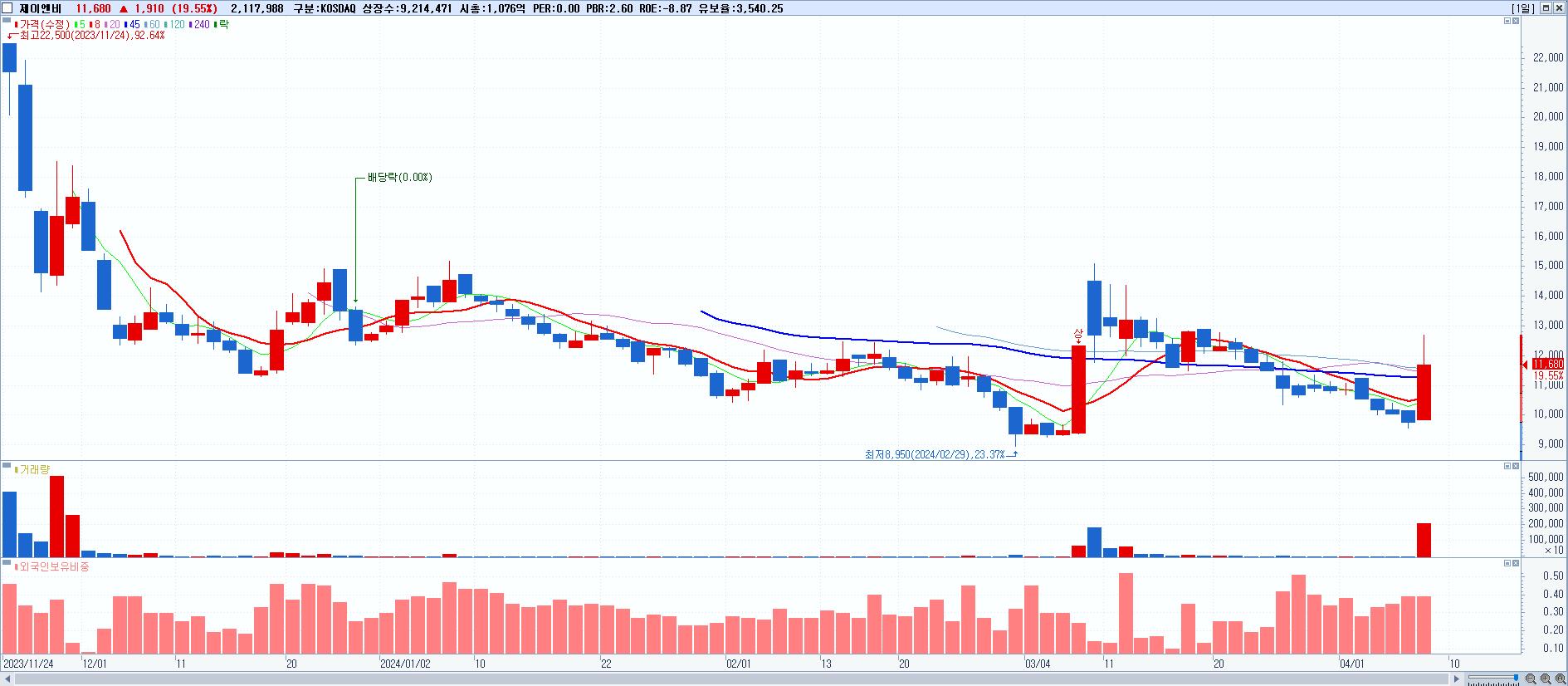 - 제이엔비 (11,680원 ▲ 19.55% , 시총: 1,076억, 거래량: 2,117,988, 거래대금:255억)