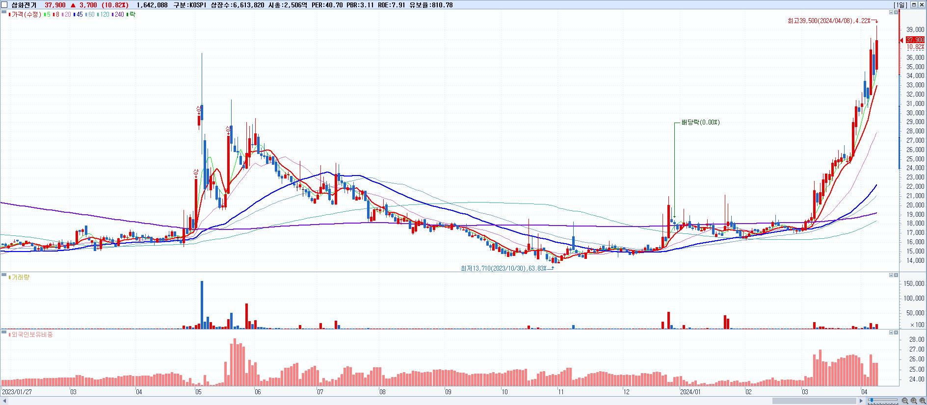 - 삼화전기 (37,900원 ▲ 10.82% , 시총: 2,507억, 거래량: 1,642,088, 거래대금:616억)