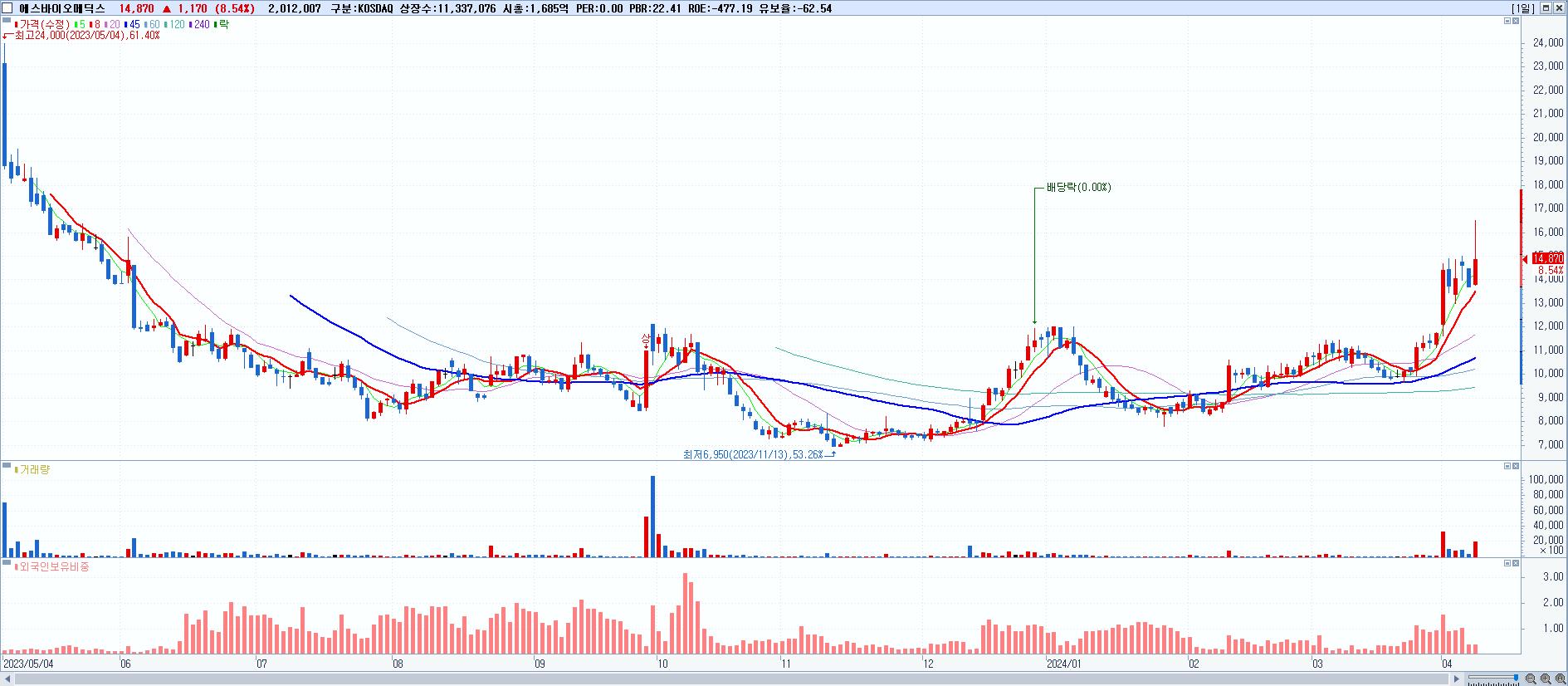 - 에스바이오메딕스 (14,870원 ▲ 8.54% , 시총: 1,686억, 거래량: 2,012,007, 거래대금:313억)