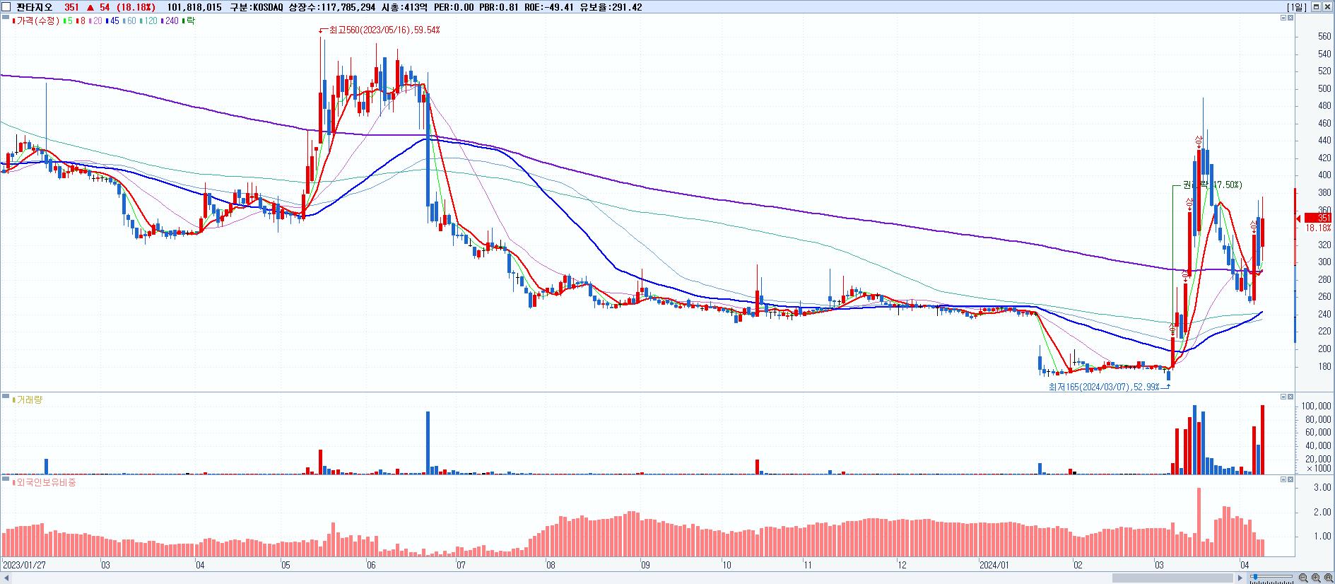 - 판타지오 (351원 ▲ 18.18% , 시총: 413억, 거래량: 101,818,015, 거래대금:353억)