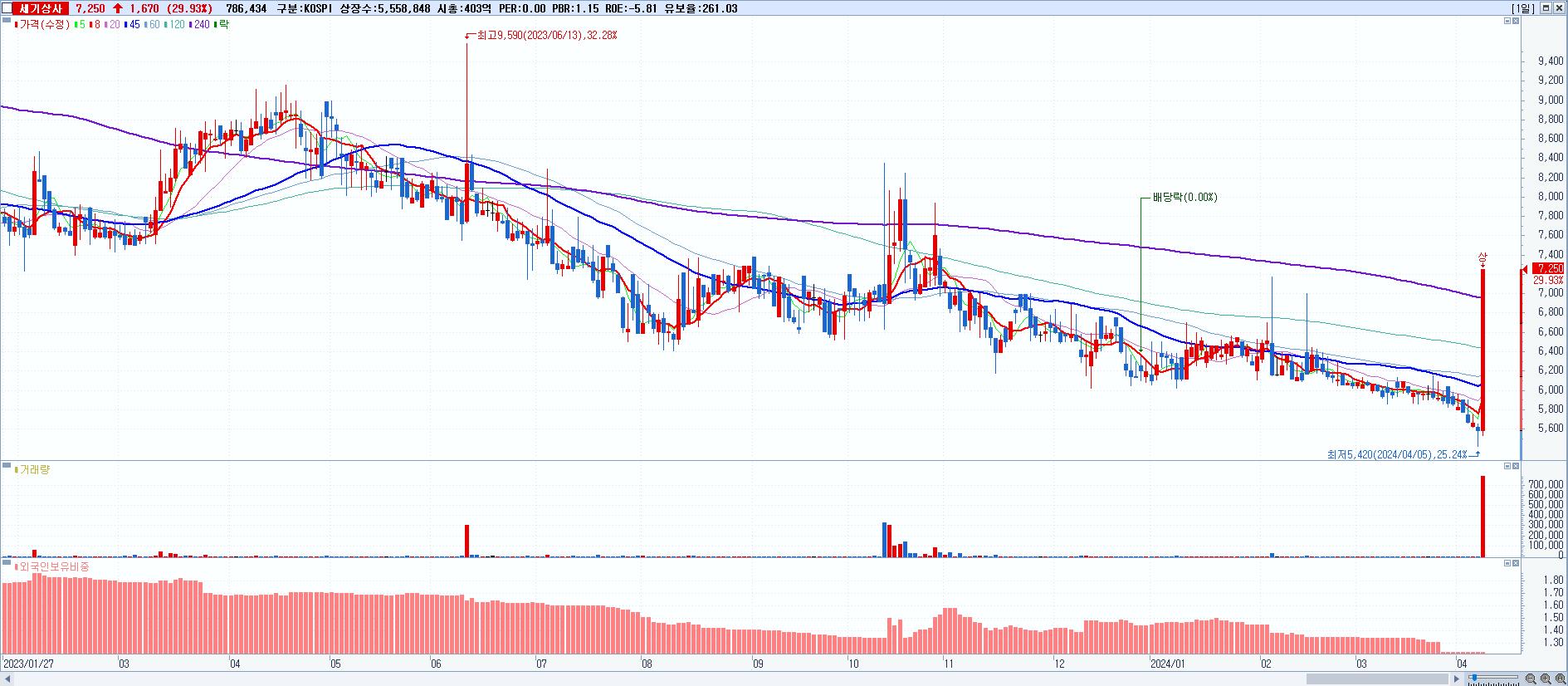 - 세기상사 (7,250원 ▲ 29.93% , 시총: 403억, 거래량: 786,434, 거래대금:56억)