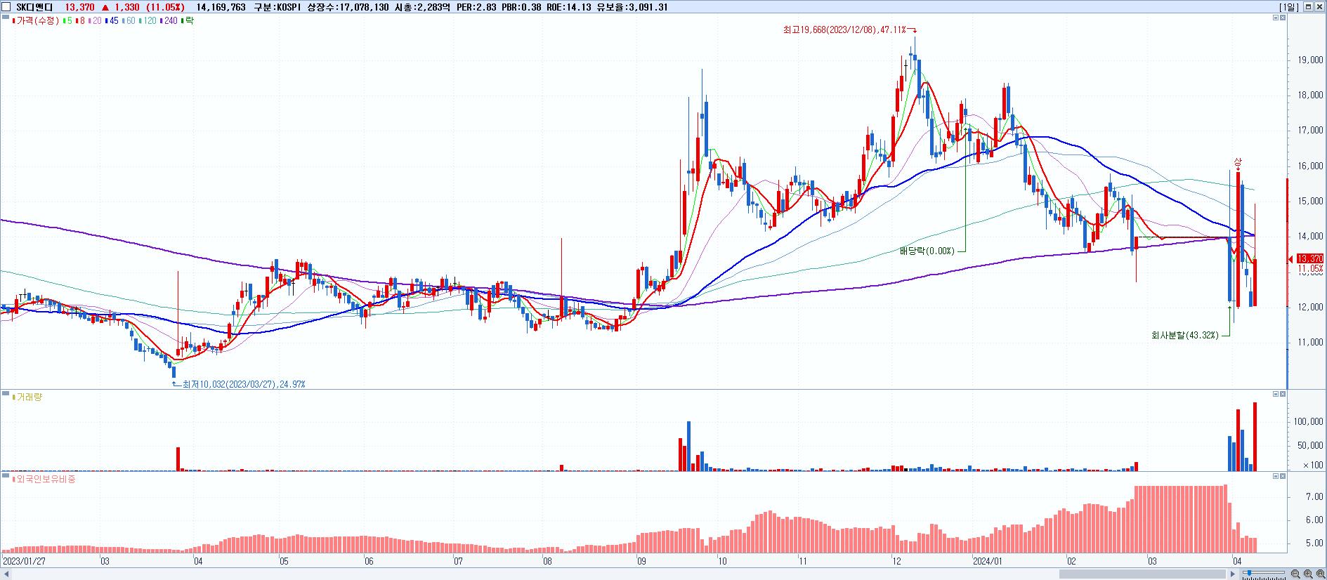 - SK디앤디 (13,370원 ▲ 11.05% , 시총: 2,283억, 거래량: 14,169,763, 거래대금:1,985억)