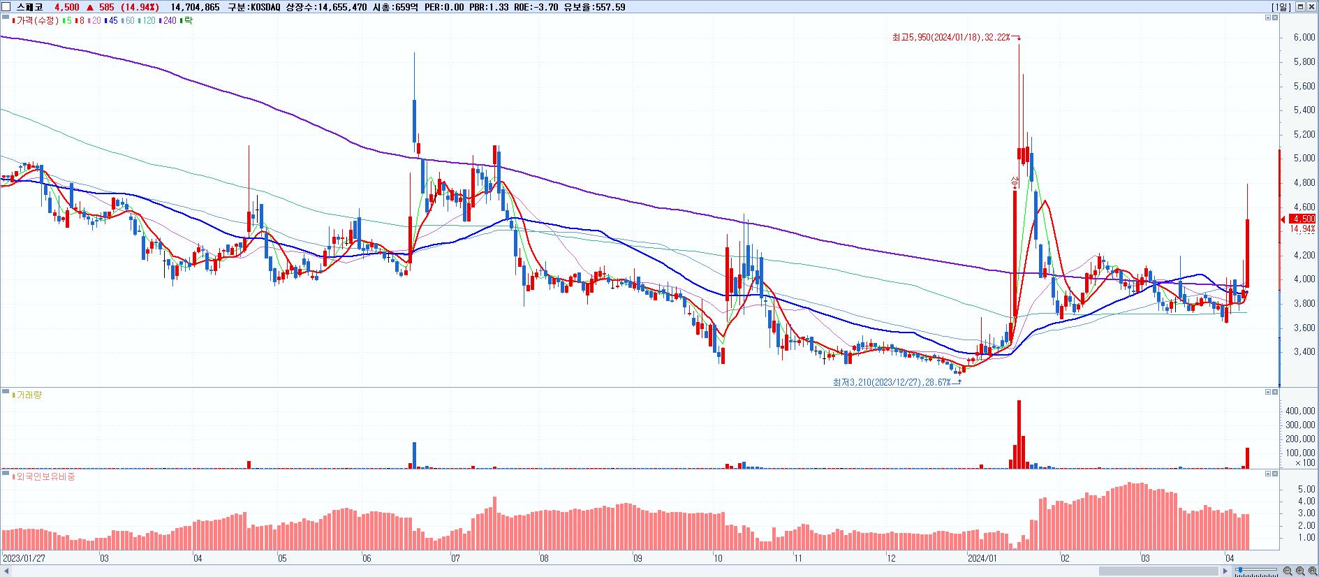 - 스페코 (4,500원 ▲ 14.94% , 시총: 659억, 거래량: 14,704,865, 거래대금:661억)