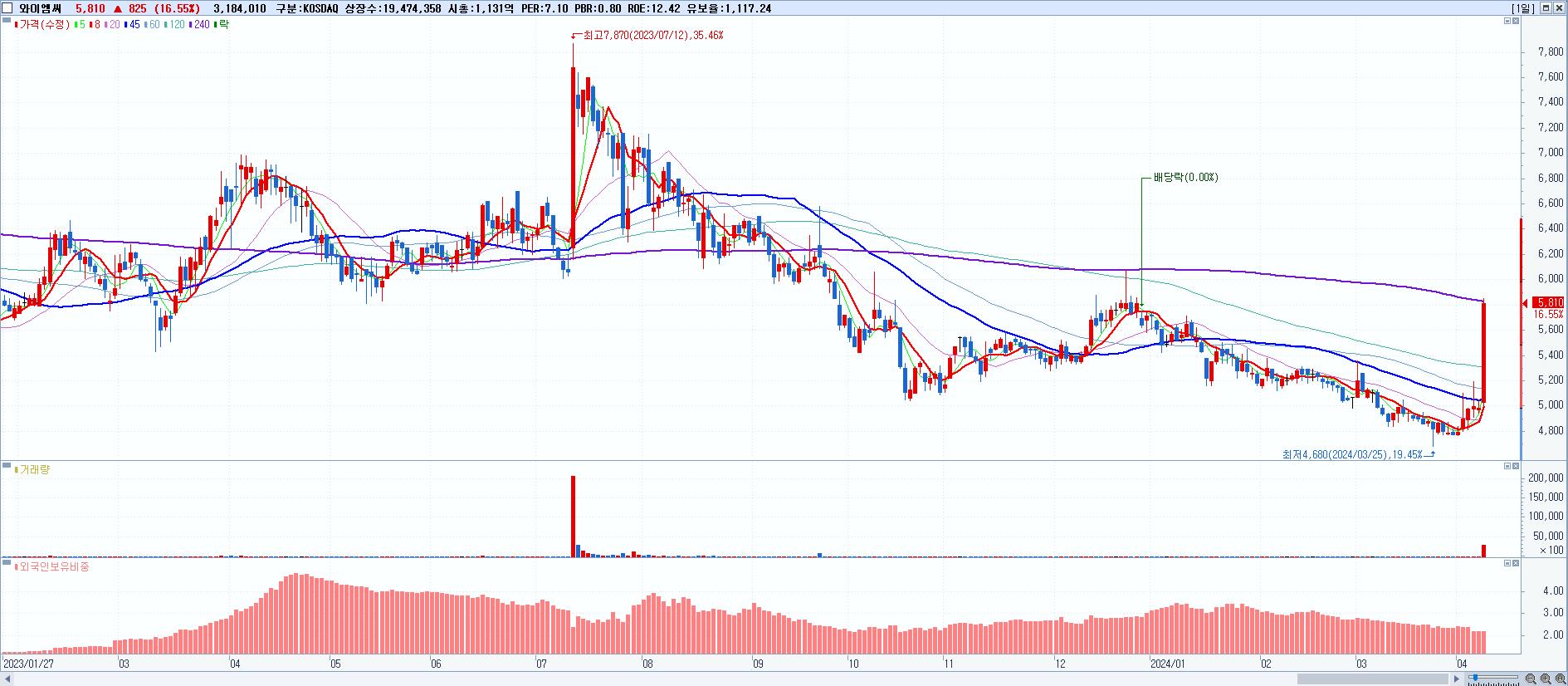 - 와이엠씨 (5,810원 ▲ 16.55% , 시총: 1,131억, 거래량: 3,184,010, 거래대금:175억)