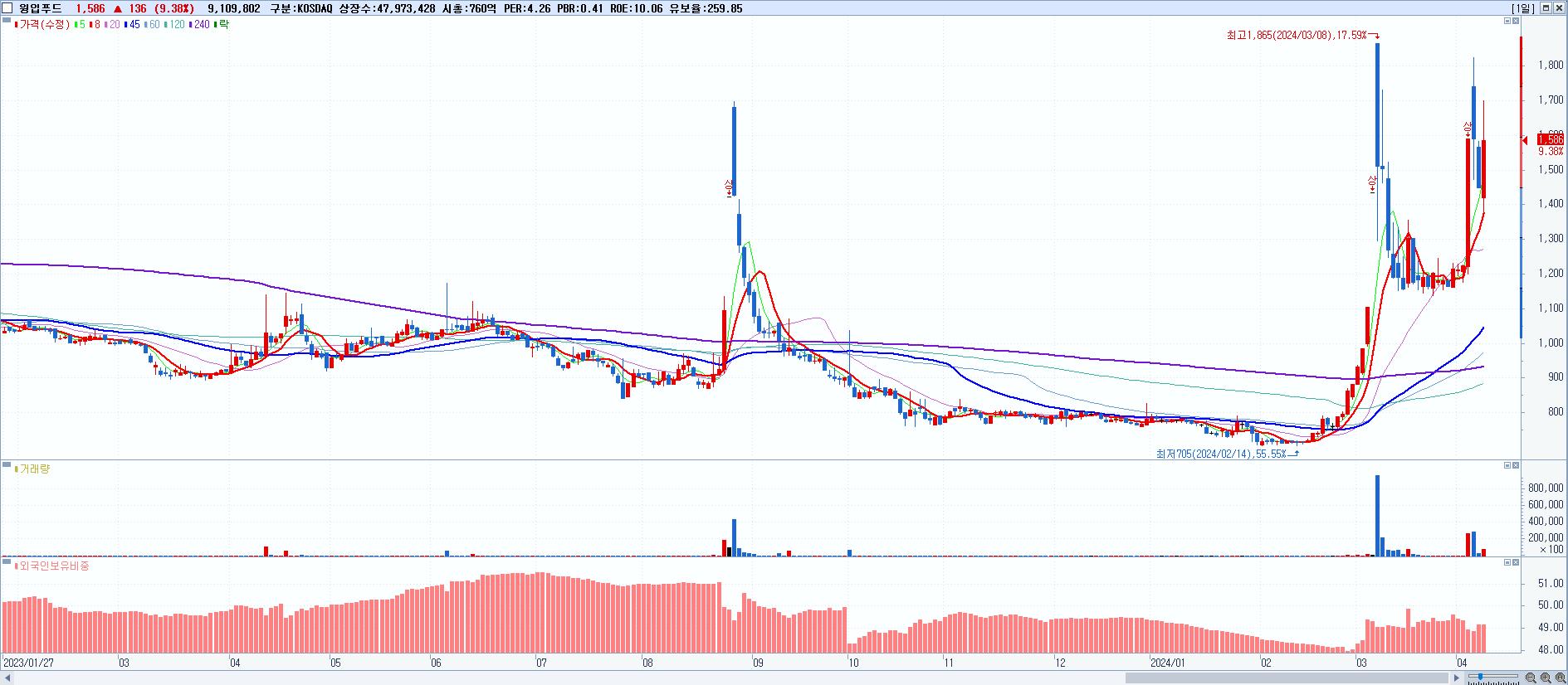 - 윙입푸드 (1,586원 ▲ 9.38% , 시총: 761억, 거래량: 9,109,802, 거래대금:143억)