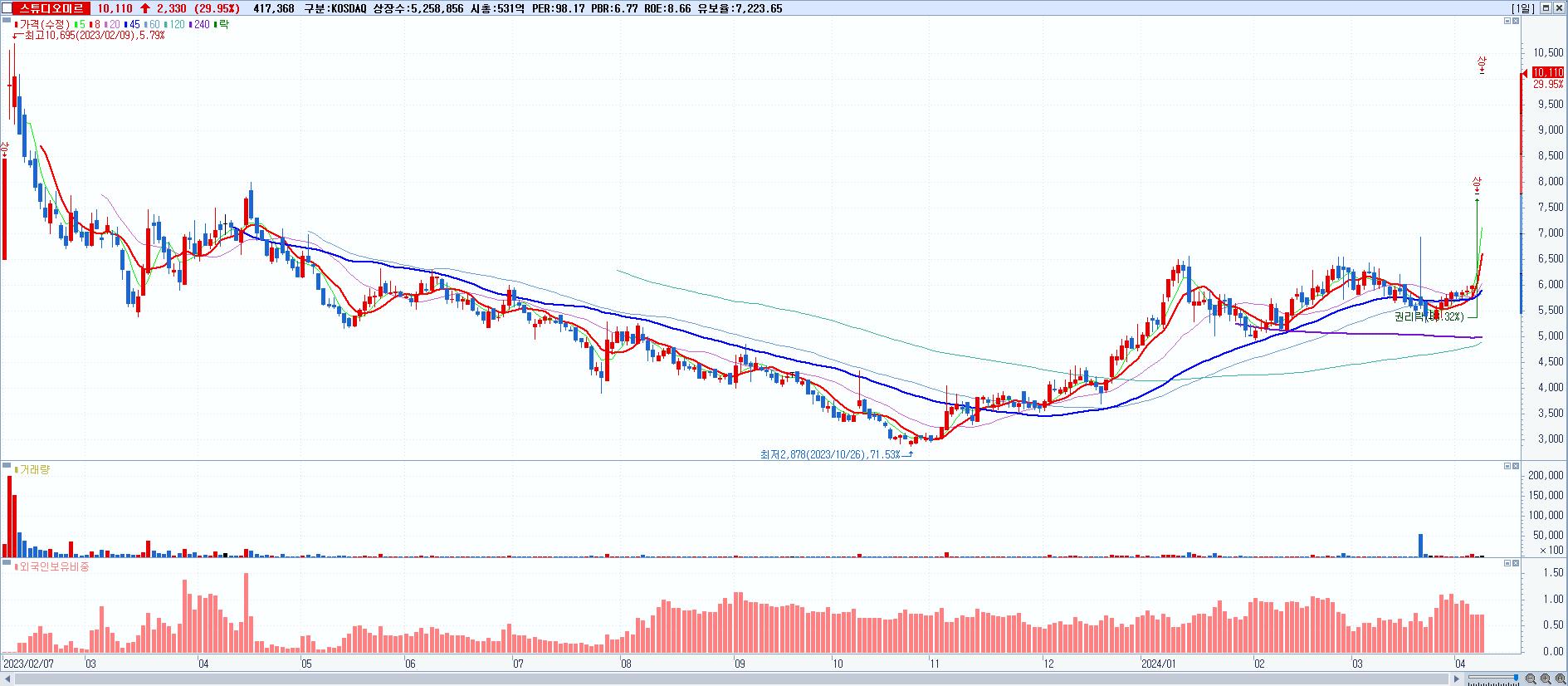 - 스튜디오미르 (10,110원 ▲ 29.95% , 시총: 532억, 거래량: 417,368, 거래대금:42억)