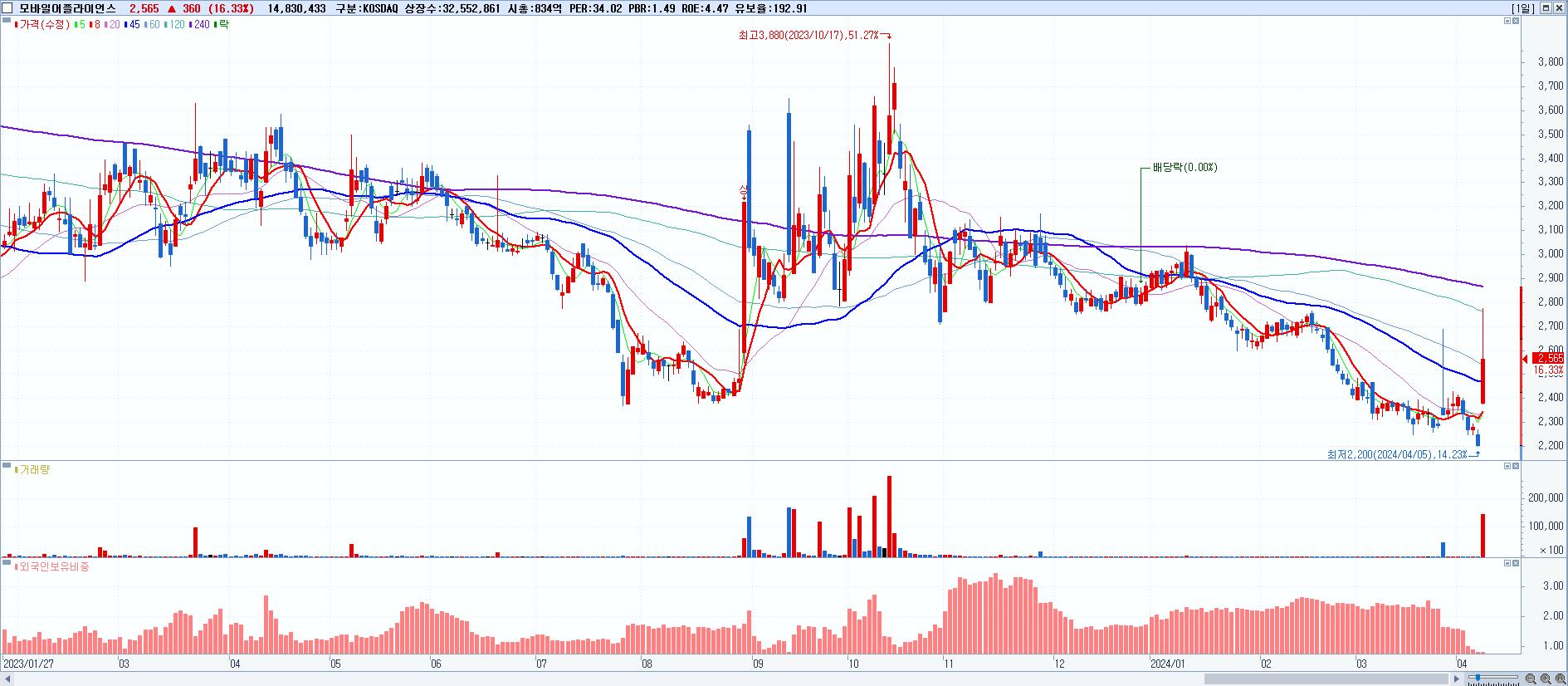 - 모바일어플라이언스 (2,565원 ▲ 16.33% , 시총: 835억, 거래량: 14,830,433, 거래대금:391억)