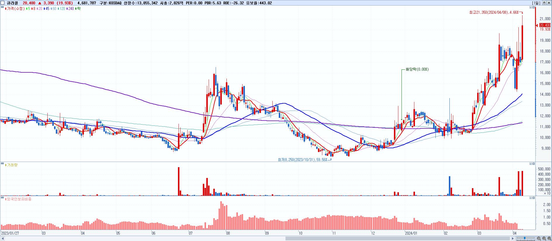 - 큐라클 (20,400원 ▲ 19.93% , 시총: 2,826억, 거래량: 4,681,787, 거래대금:941억)