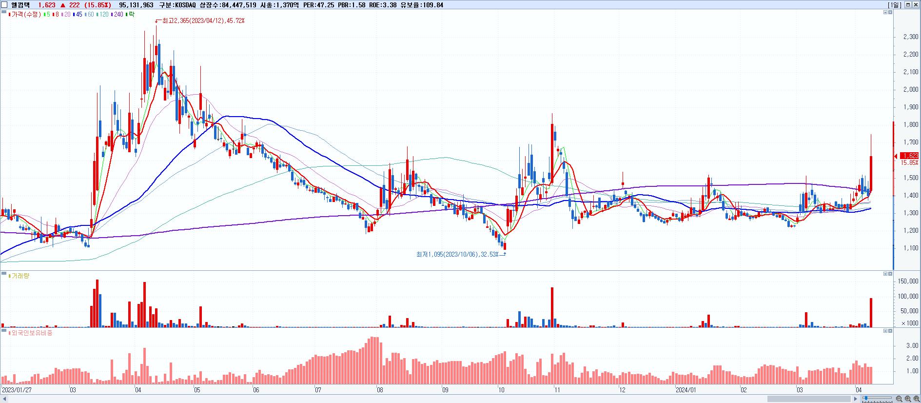 - 엘컴텍 (1,623원 ▲ 15.85% , 시총: 1,371억, 거래량: 95,131,963, 거래대금:1,564억)